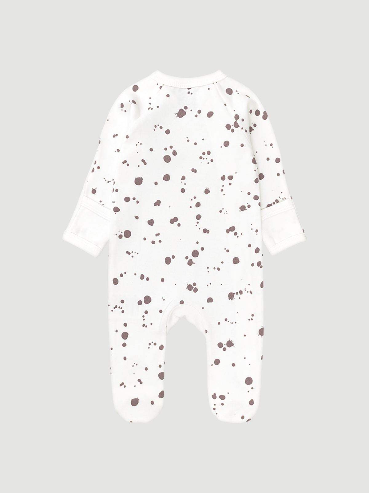 Модель комбинезона Mjölk Sleep and Play Кляксы отличается оригинальным пошивом: спинка изделия выполнена из той же ткани, что и рукава с носочками, а грудка и ножки спереди – в нежном оттенке экрю. Принт выглядит нарядно: стильные кляксы на молочном фоне.