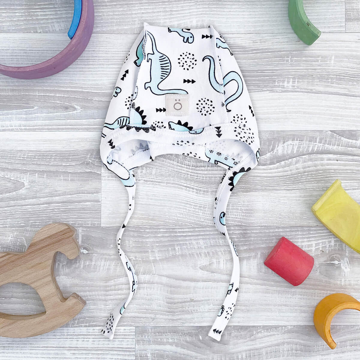 Чепчик mjölk [мьёльк] Динозавры выполнен из тонкого трикотажного хлопка, который мягко облегает головку и ушки малыша, и дарит новорожденному комфорт.