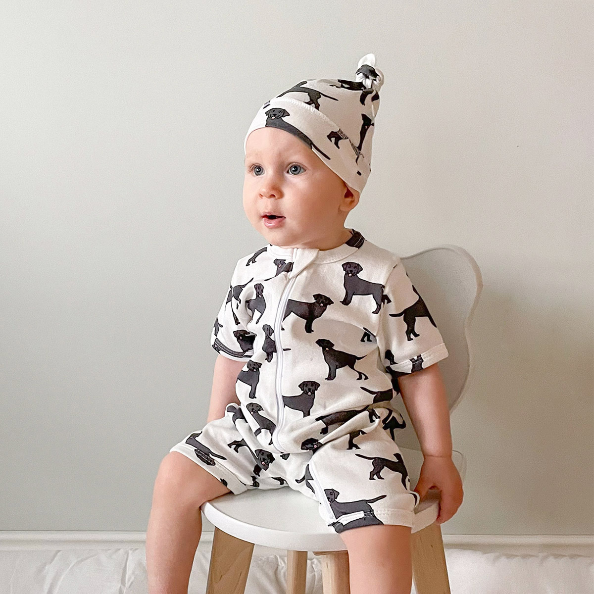 Шапочка с узелком Mjölk [мьёльк] Собачки выполнена из нежного трикотажного 100% хлопка. Материал эластичный, не вызывает аллергии, дарит ребёнку уют и комфорт, а оригинальный принт придаёт малышу яркий и нарядный образ.