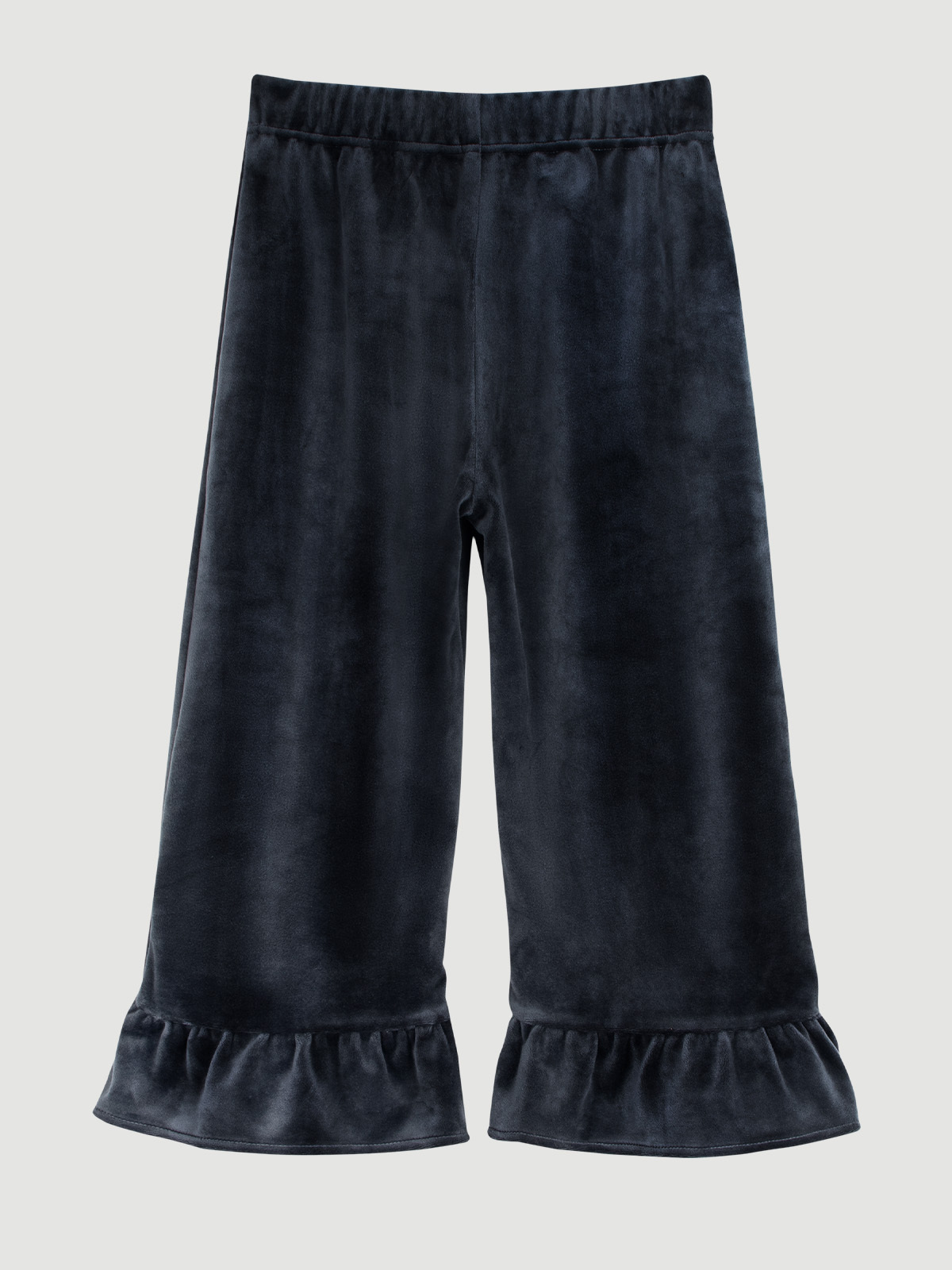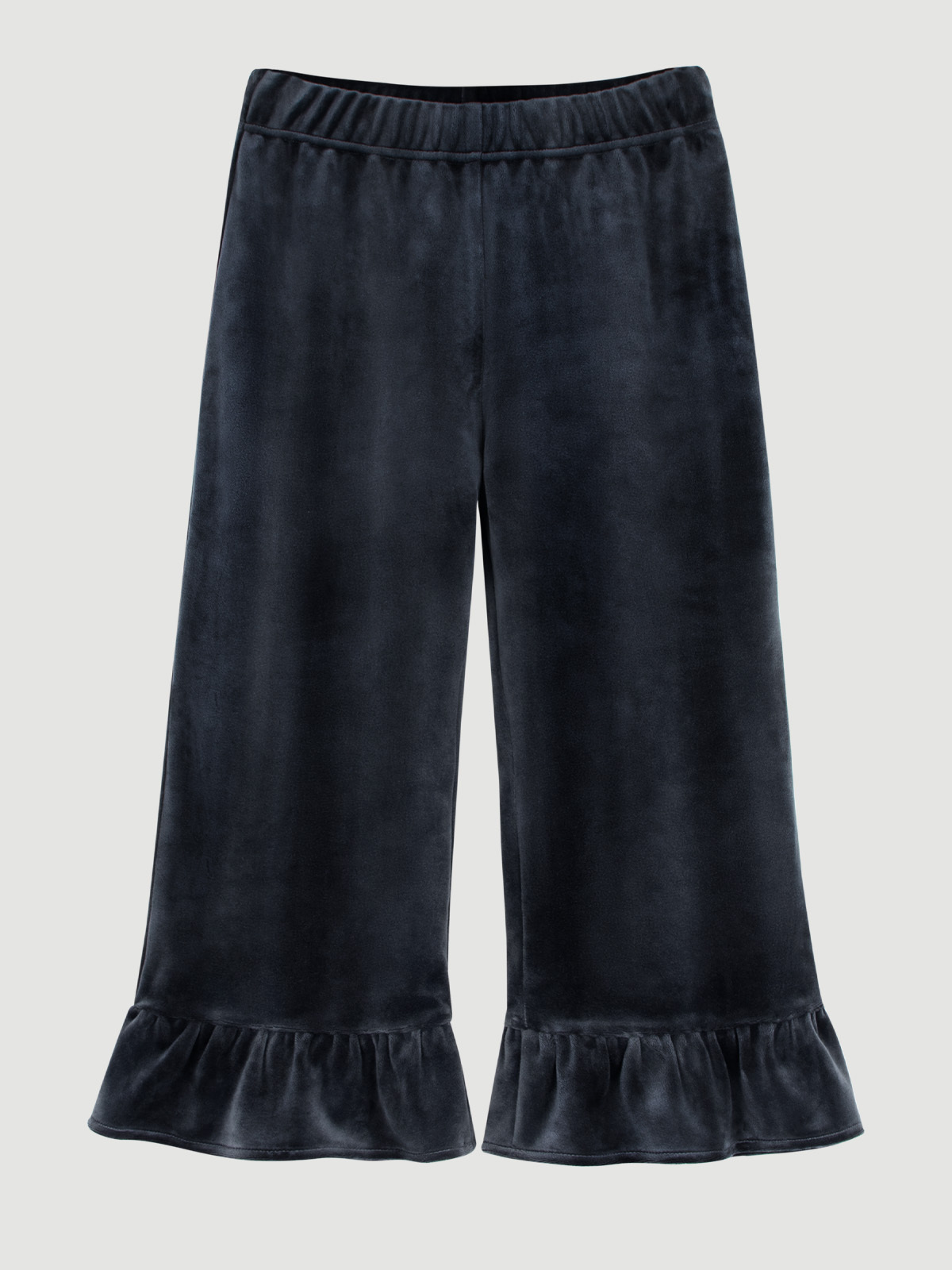 Велюровые брюки с воланами для девочки - это самая настоящая нежность в движении! Мягкий свободный крой и романтичные воланы по низу бархатистых брюк. Волшебные брюки для создания самого воздушного праздничного образа.
