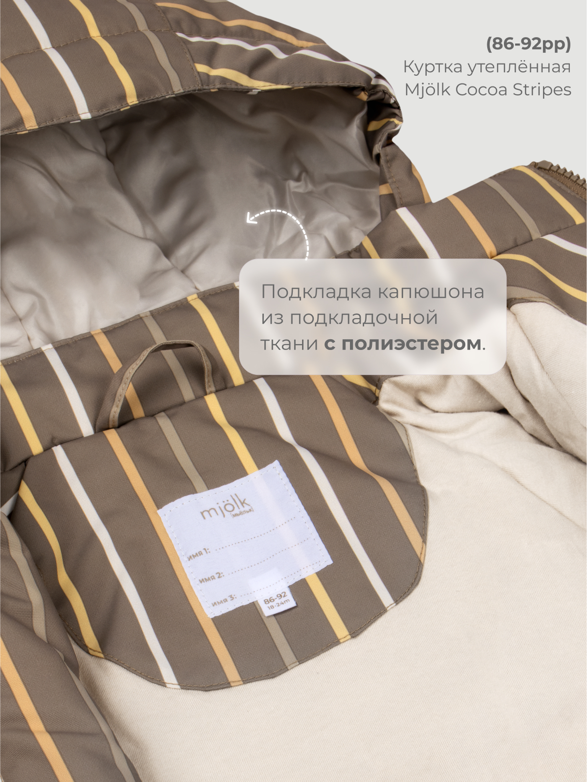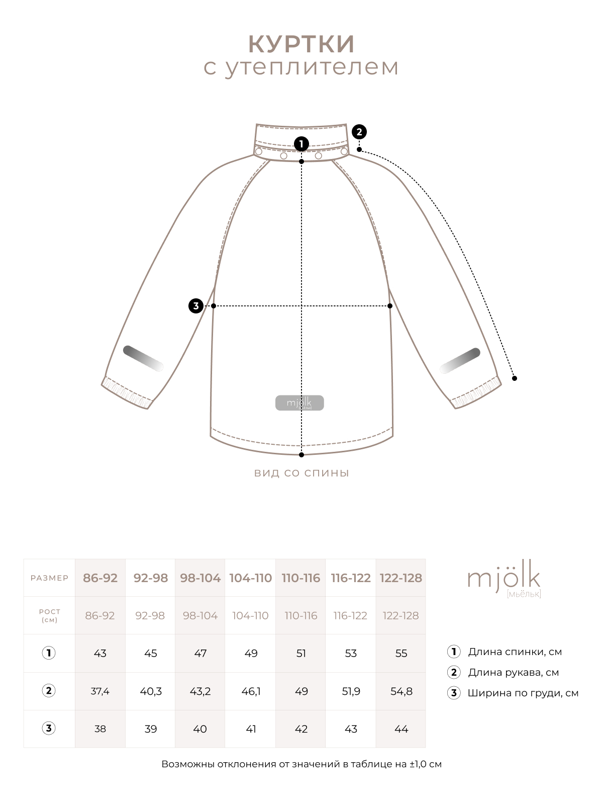 Демисезонная куртка Mjölk [мьёльк] Основные швы куртки проклеены, а сама он изготовлена из водо- и ветронепроницаемой, грязеотталкивающей мембраны. Мембранная ткань обеспечит дополнительную защиту во время активных игр. Гладкая подкладка и удобная молния помогают комфортному надеванию верхней одежды. Курточка утепленная Mjölk [мьёльк] отлично подойдет на холодную осень или теплую зиму для мальчиков и для девочек. Используя изделия с мембраной, стоит придерживаться принципа многослойности: надевать на ребёнка первый слой (лонгсливы, легинсы, термобелье) и промежуточные (например, костюм из футера или свитшот с джоггерами). Регулировать теплоту нужно именно слоями: для тёплой зимы их потребуется меньше, для сильных холодов - больше.