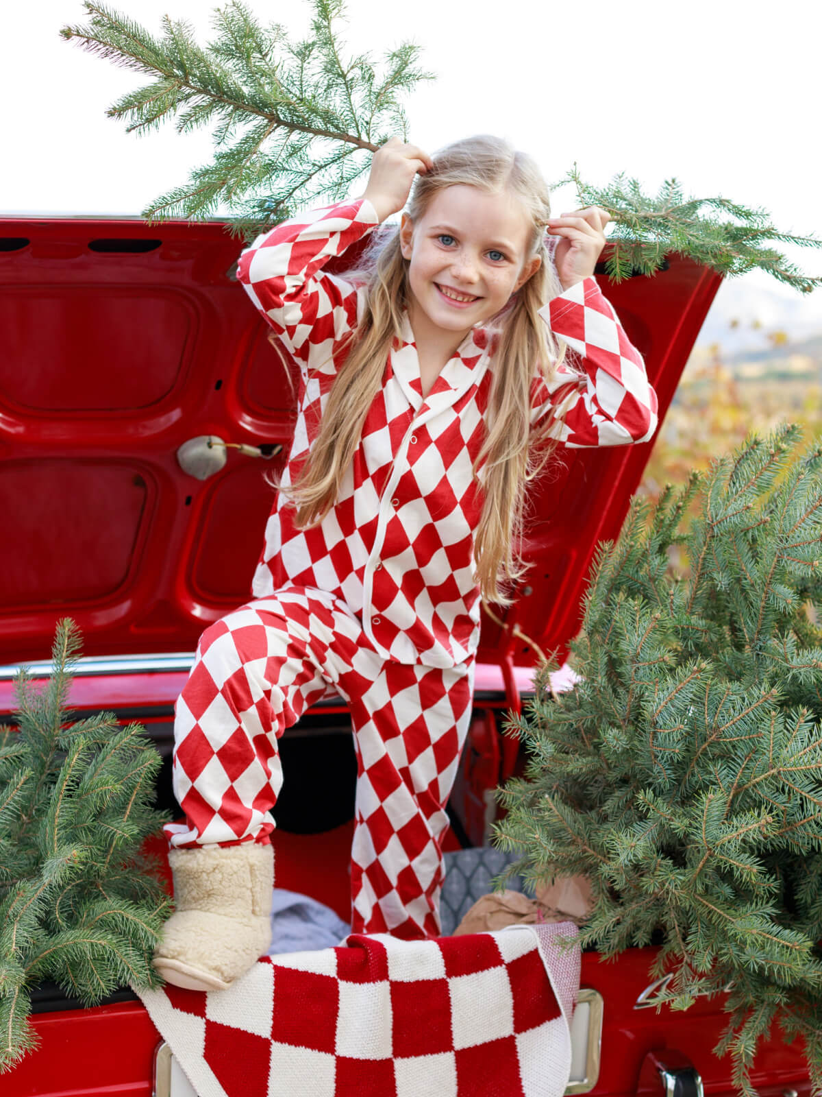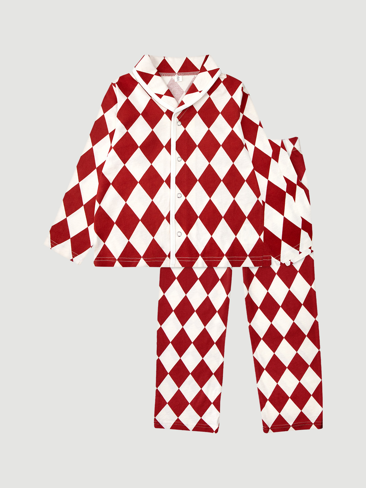 Новогодняя пижама с воротом изготовлена из трикотажного хлопка под названием интерлок. Интерлок – это плотный трикотаж двойного плетения хлопчатобумажных нитей. Одежда для детей из такого материала долго носится, хорошо сохраняет цвет и форму. Плюсы материала: