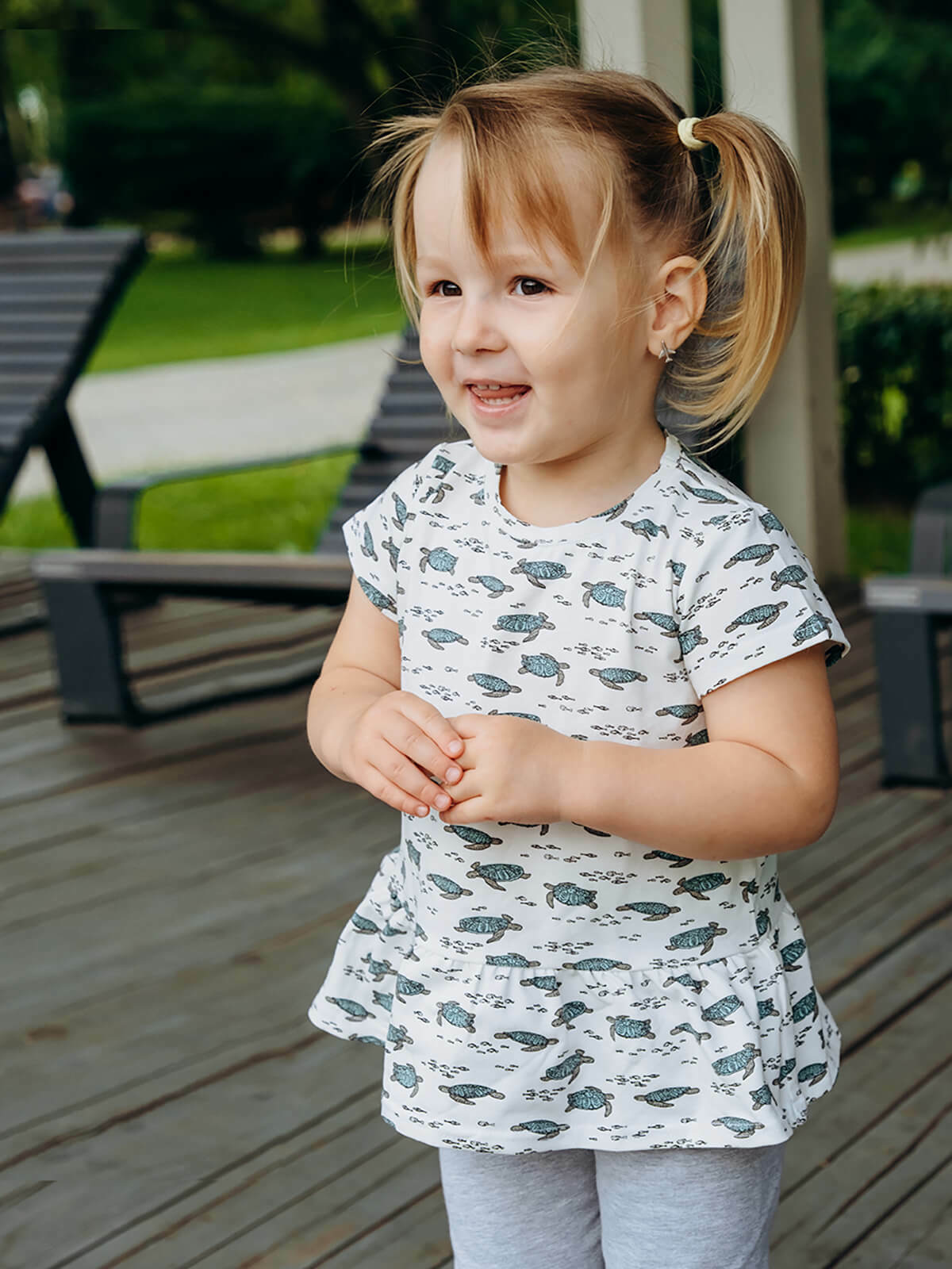 Туника для девочки из натурального хлопка с небольшим добавлением лайкры. Трикотажная туника для девочки изготовлена из гипоаллергенной, мягкой ткани, которая хорошо пропускает воздух и устойчива к носке. Для сохранения первоначальных свойств изделия, очень важно соблюдать рекомендации по уходу, указанные на ярлычке. Идеально для детского сада, одежда для домашней носки.