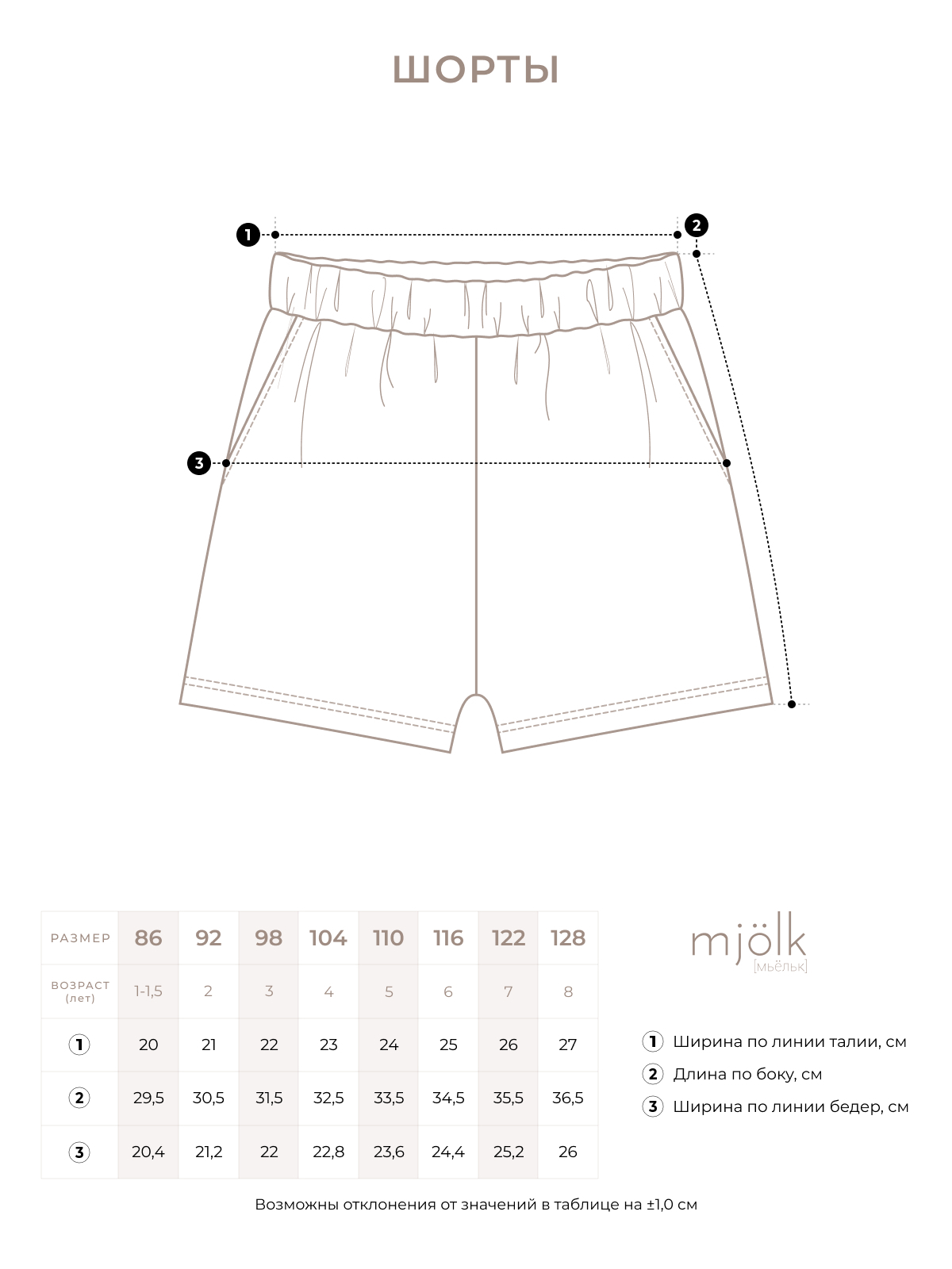 Трикотажные шорты с принтом от mjolk изготовлены из кулирной глади, что дарит идеальную посадку. Пояс на резинке позволяет носить шортики малышу с любой фигурой и комплекцией. Стильные шорты для детей подходят для повседневного использования дома, для детского сада и для улицы. Это базовые шорты для активных игр и прогулок. Составят отличный комплект с футболками mjolk. Идеально сочетаются с топами, объемными свитшотами, подойдут к любимым кроссовкам и кедам.
