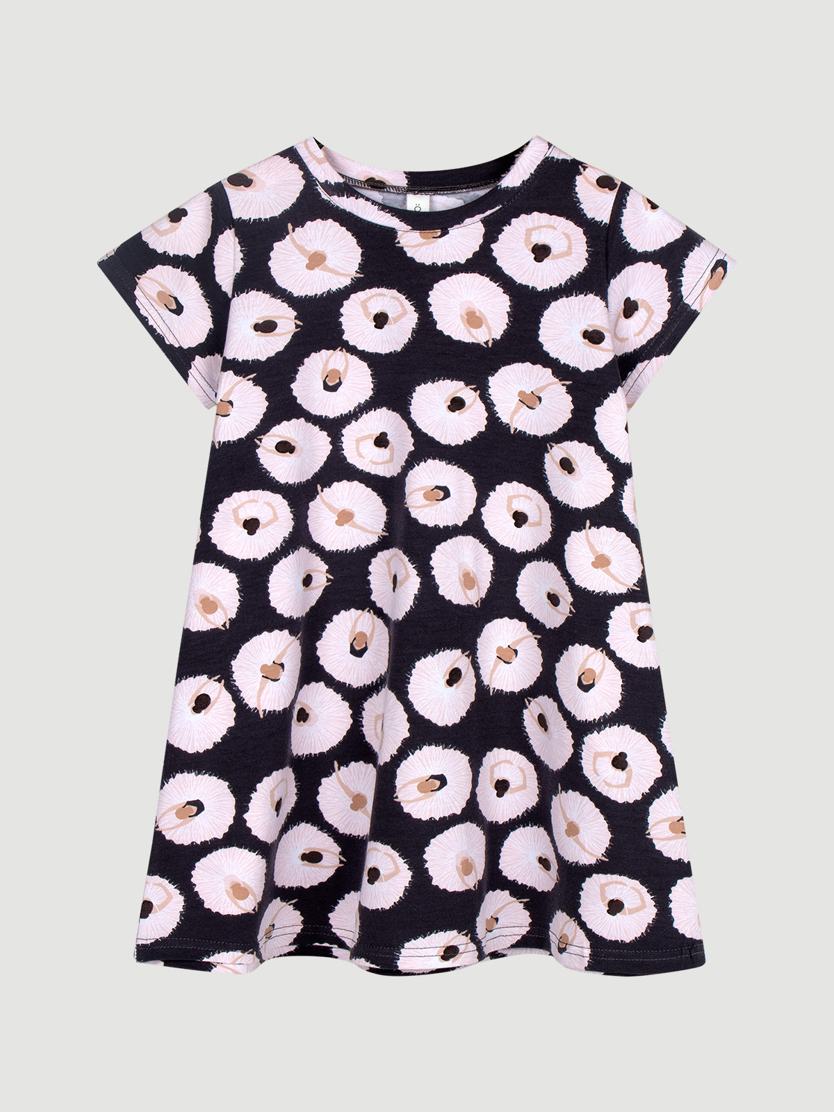 Детское платье для девочки Mjölk [мьёльк]. Силуэт трапеция, короткие рукава, круглый вырез. Яркий и стильный принт понравится с первого взгляда и дополнит любой гардероб.