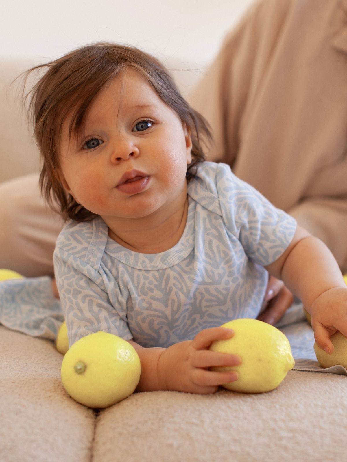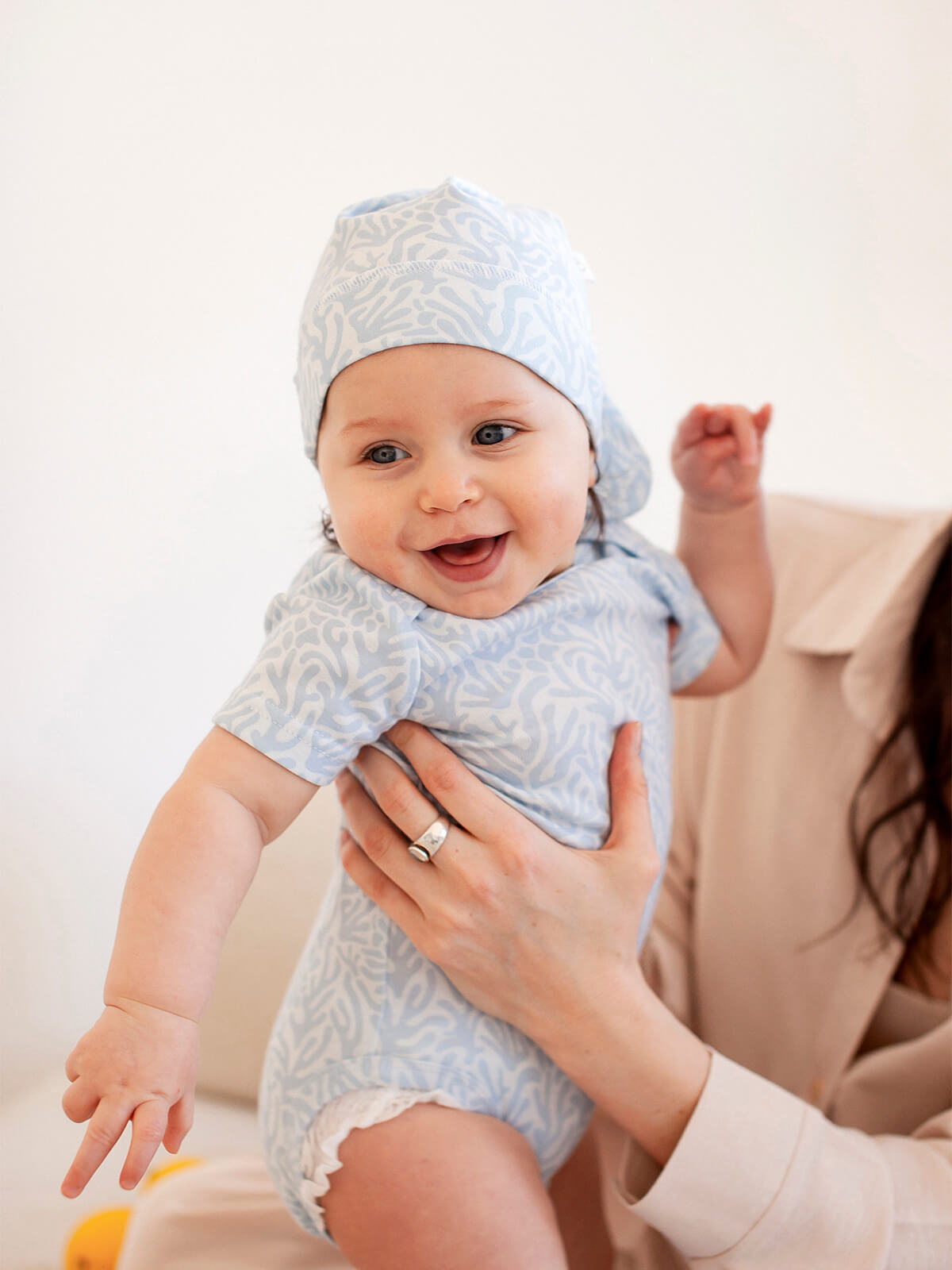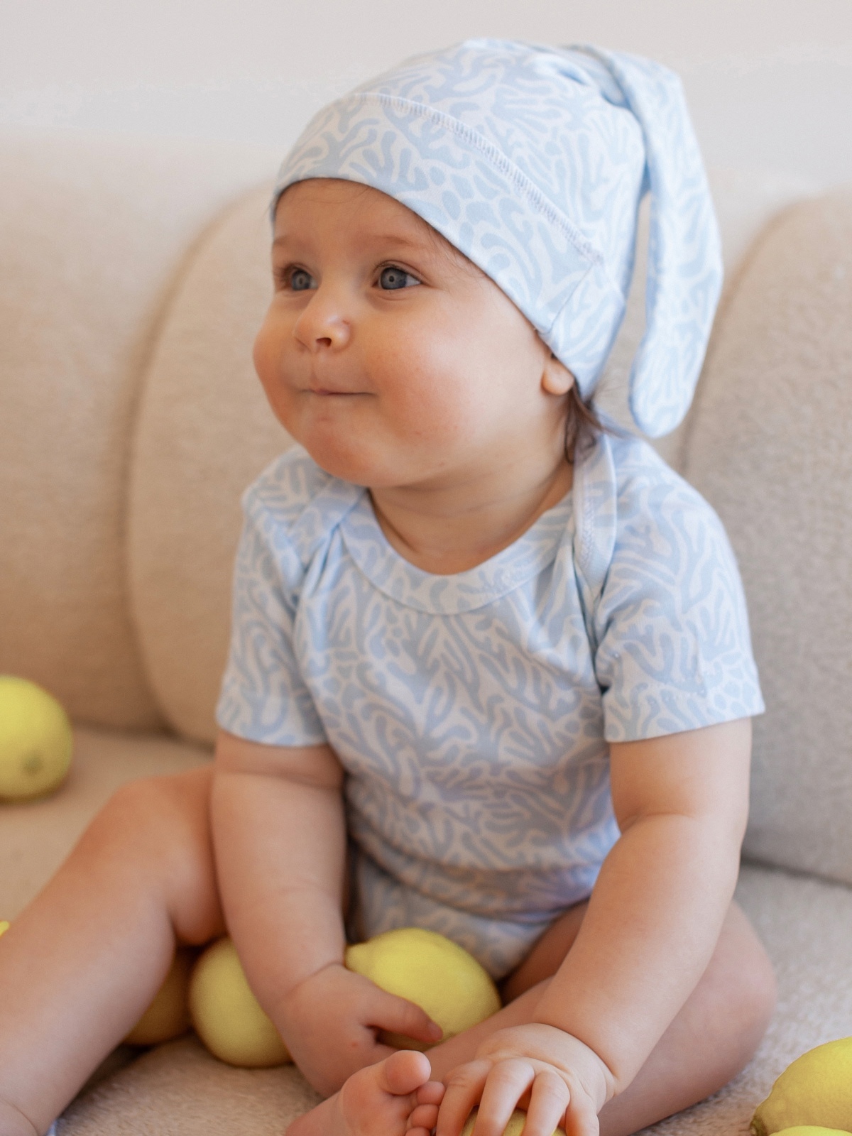 В сопутствующих товарах можно подобрать изделия в комплект с таким же принтом: мягкую шапочку с узелком, двусторонний плед, сет пелёнок в тон или яркий комбинезон.