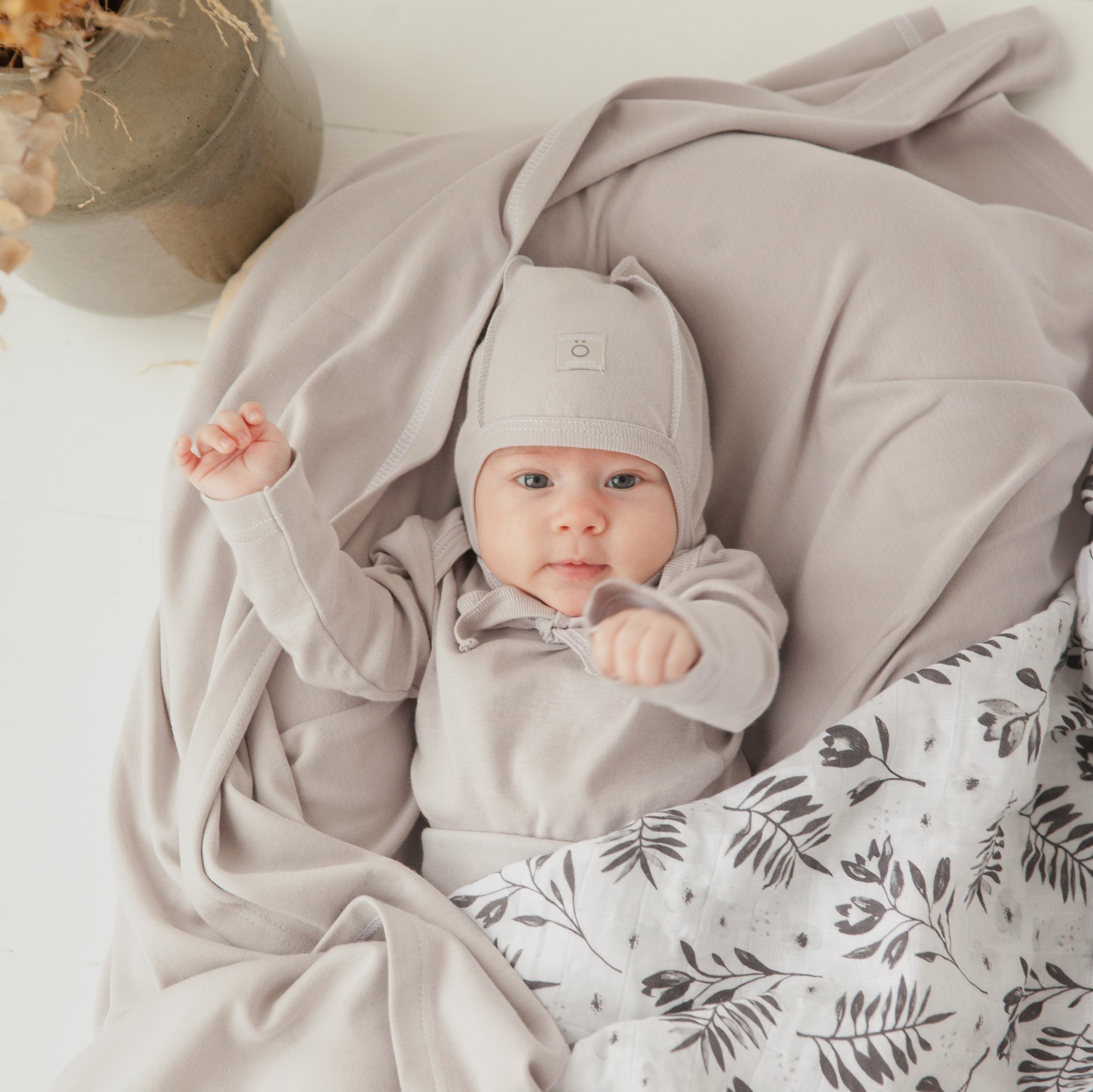 Чепчик Mjölk выполнен из тонкого трикотажного хлопка, который мягко облегает головку и ушки малыша, и дарит новорожденному комфорт.