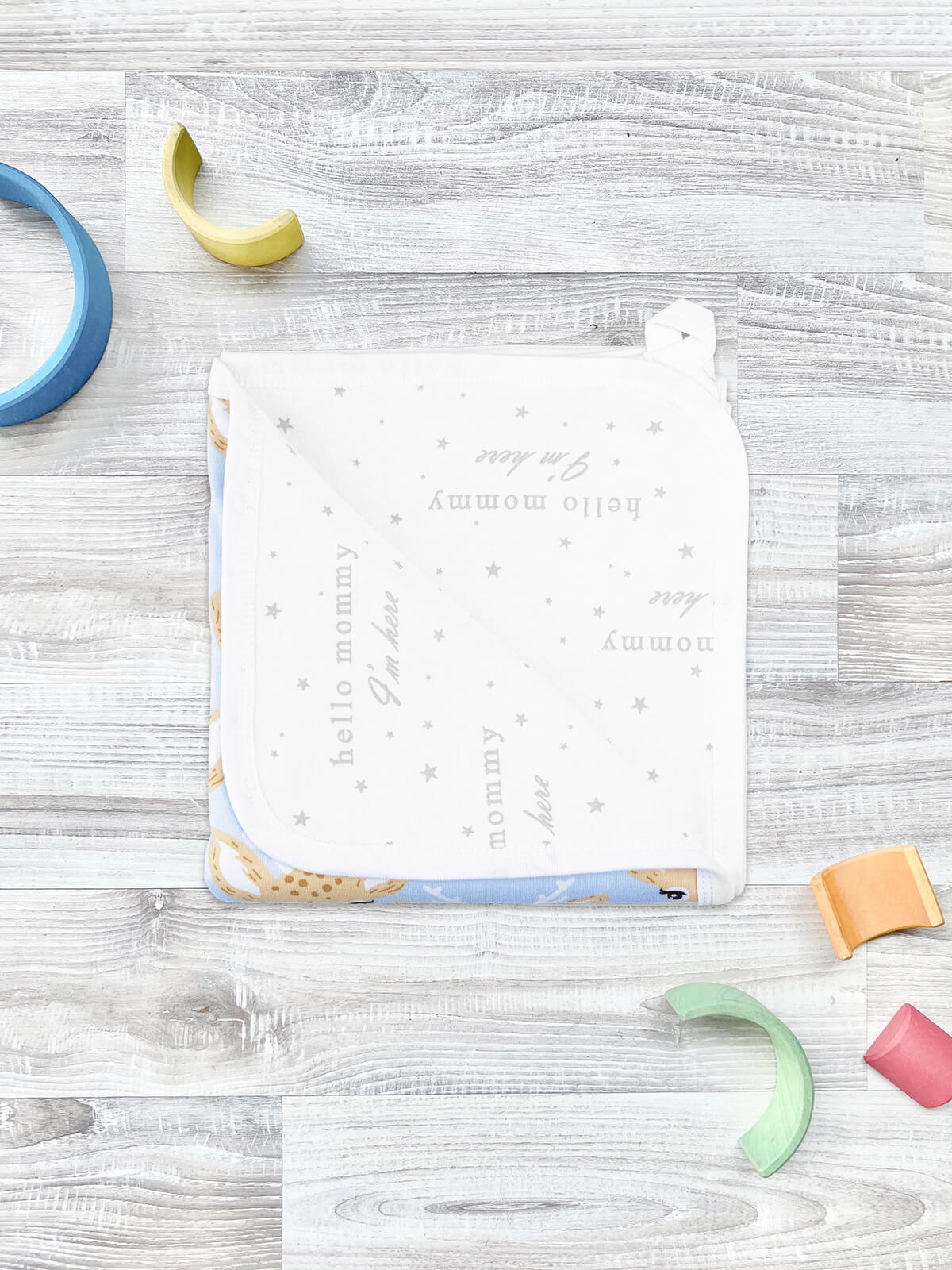 Двусторонний плед Mjölk [мьёльк] Оленята NEW выполнен из двух слоёв трикотажного 100% хлопка без наполнителя. Одну сторону пледа украшает рисунок из милых оленей на голубом фоне, а на второй стороне расположились нежные строки "Hello Mommy, I'm here", что в переводе с английского означает "Привет, мамочка. Я здесь". Размер пледа можно выбрать: 80 см*80 см или 120 см*85 см. Материал нежный и мягкий, «дышит», не вызывает аллергии и дарит ребёнку уют. Плед можно использовать для сна в кроватке, коляске и автокресле, как накидку для кормления. Яркий принт делает его отличным фоном для фотосессий в домашних условиях или на улице.