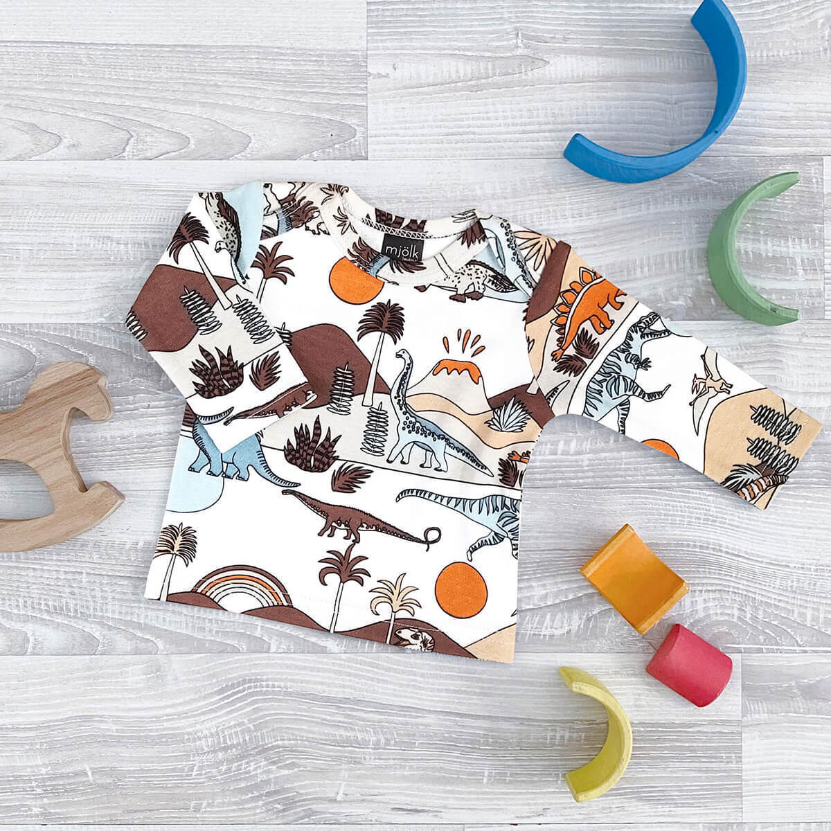 Футболка с длинным рукавом Mjölk [мьёльк] Dinoworld подойдёт мальчикам и девочкам, милый принт разноцветных динозавров на белом фоне. Дополнить образ можно шапочкой и ползунками в тон, или же подобрать плед и нагрудник в сопутствующих товарах.
