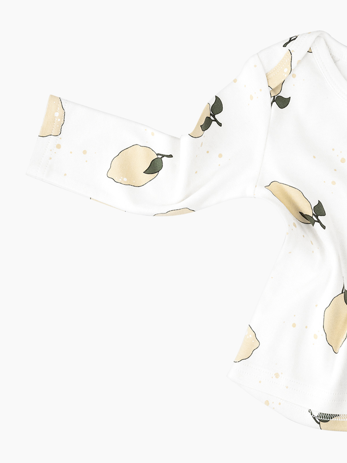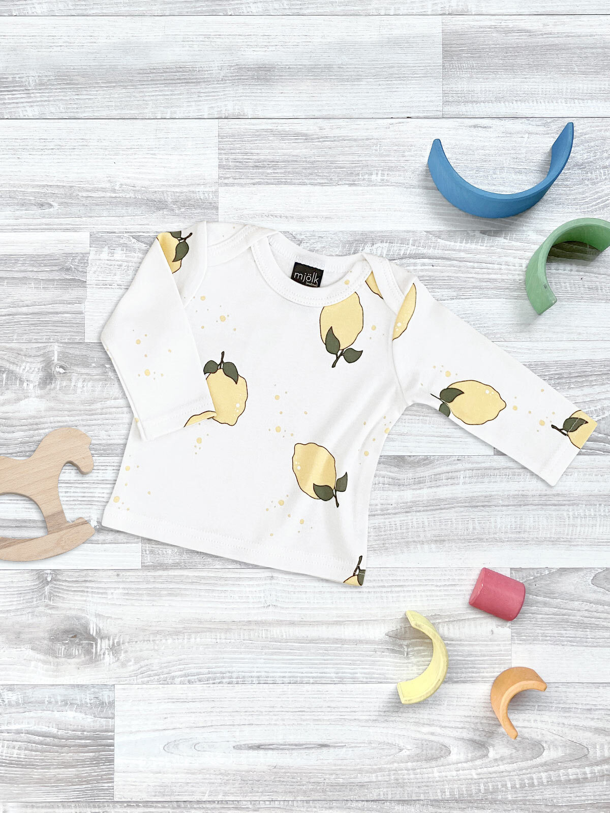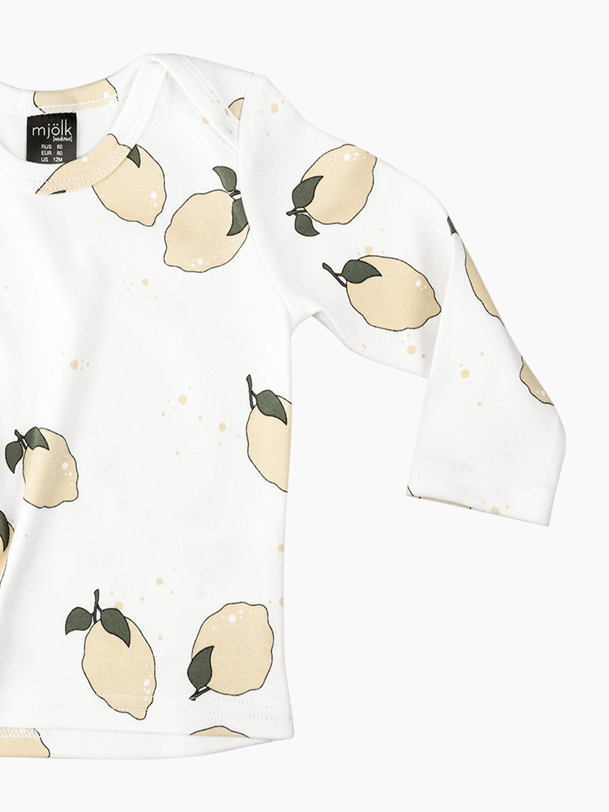 Футболка с длинным рукавом Mjölk [мьёльк] Лимоны подойдёт мальчикам и девочкам, желтые лимоны на белом фоне станут прекрасным дополнением гардероба. Дополнить образ можно шапочкой и ползунками в тон, или же подобрать плед и нагрудник в сопутствующих товарах.