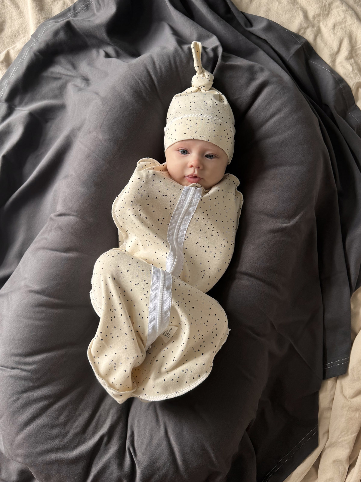 Пеленальный кокон Mjölk [мьёльк] на двухзамковой молнии выполнен из трикотажного хлопка, который подходит нежной коже новорожденного, не вызывает аллергии и дарит малышу комфорт и спокойствие. В коконе Ваш ребенок будет спокойно спать без возможности распеленаться и разбудить себя.