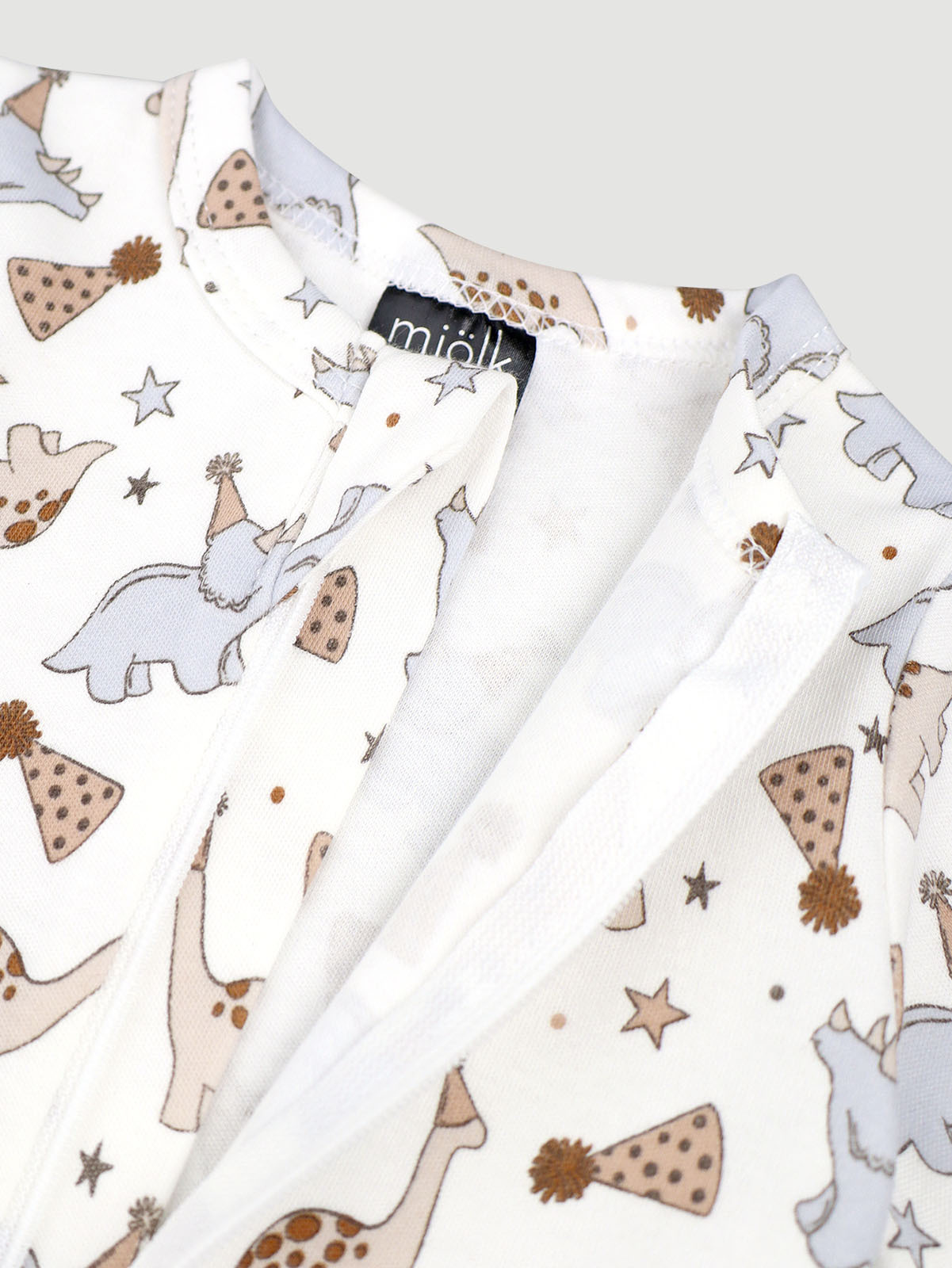 Молния изнутри защищена планкой, поэтому не соприкасается с нежной кожей малыша, а на вороте у шеи дополнительно нашит трикотажный язычок. Он закрывает бегунок и не даёт застёжке раскрыться.