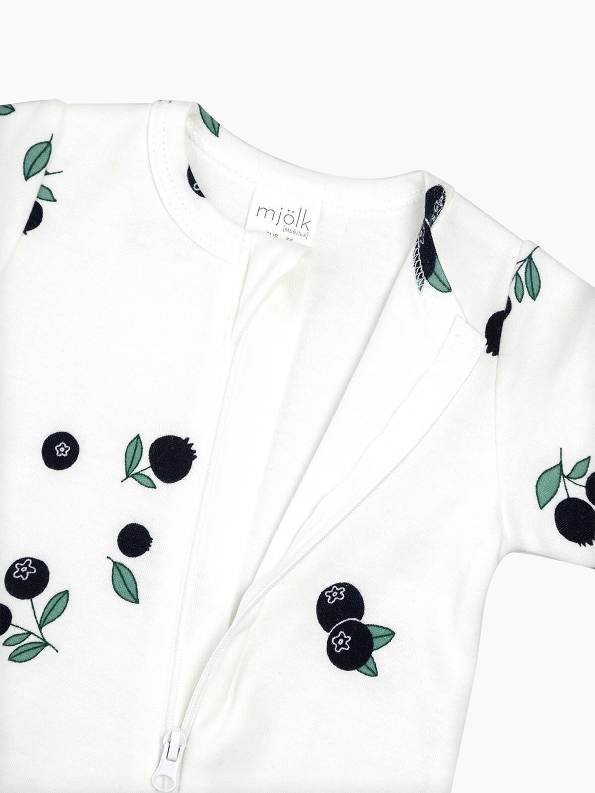 Песочник Mjölk [мьёльк] Sleep and Play Голубика – это комбинезон на молнии с короткими рукавами и штанинами, выполненный из плотного и очень мягкого трикотажа.