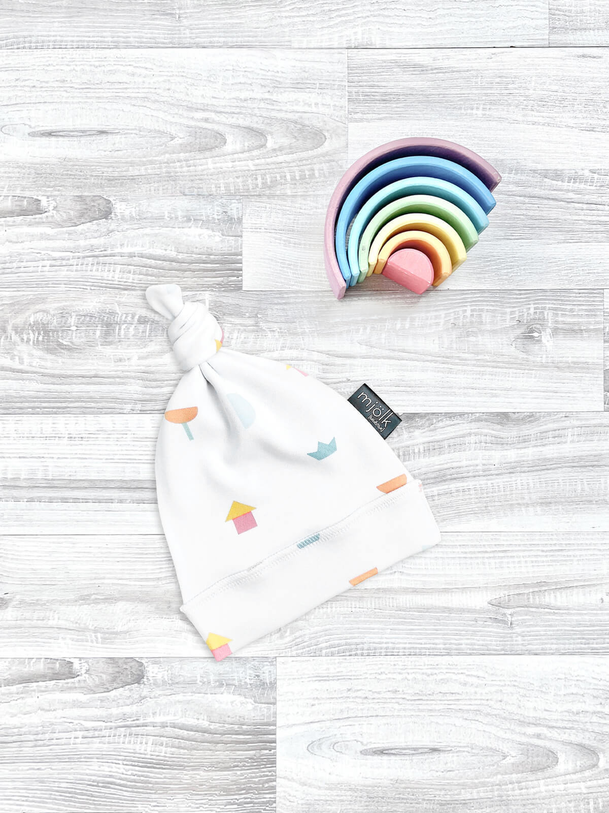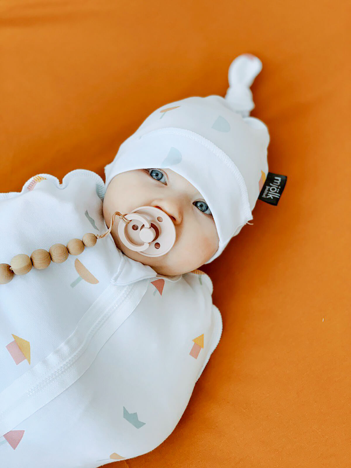 Шапочка с узелком Mjölk выполнена из трикотажного хлопка, который подходит нежной коже новорожденного, не вызывает аллергии и дарит малышу комфорт.