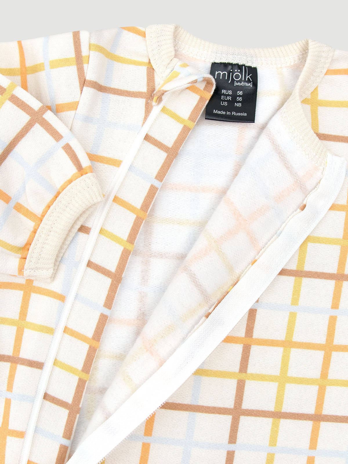 Материал плотный и приятный на ощупь, не вызывает аллергии. Молния изнутри защищена планкой, поэтому не соприкасается с нежной кожей малыша, а на вороте у шеи дополнительно нашит трикотажный язык. Он закрывает бегунок и не даёт застёжке раскрыться.