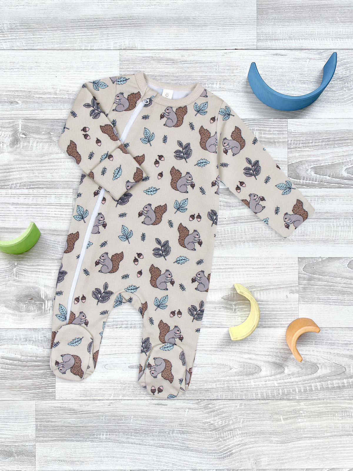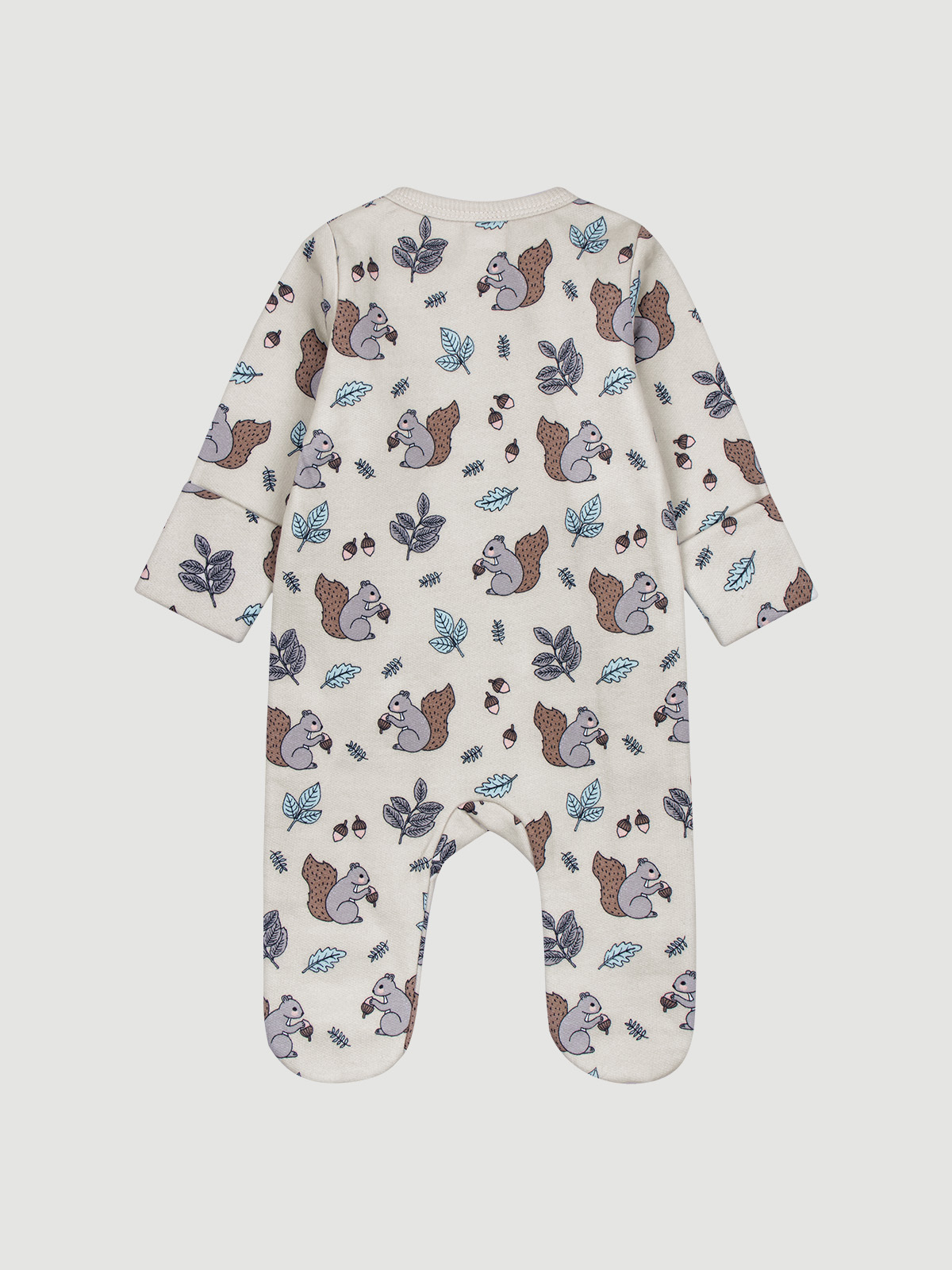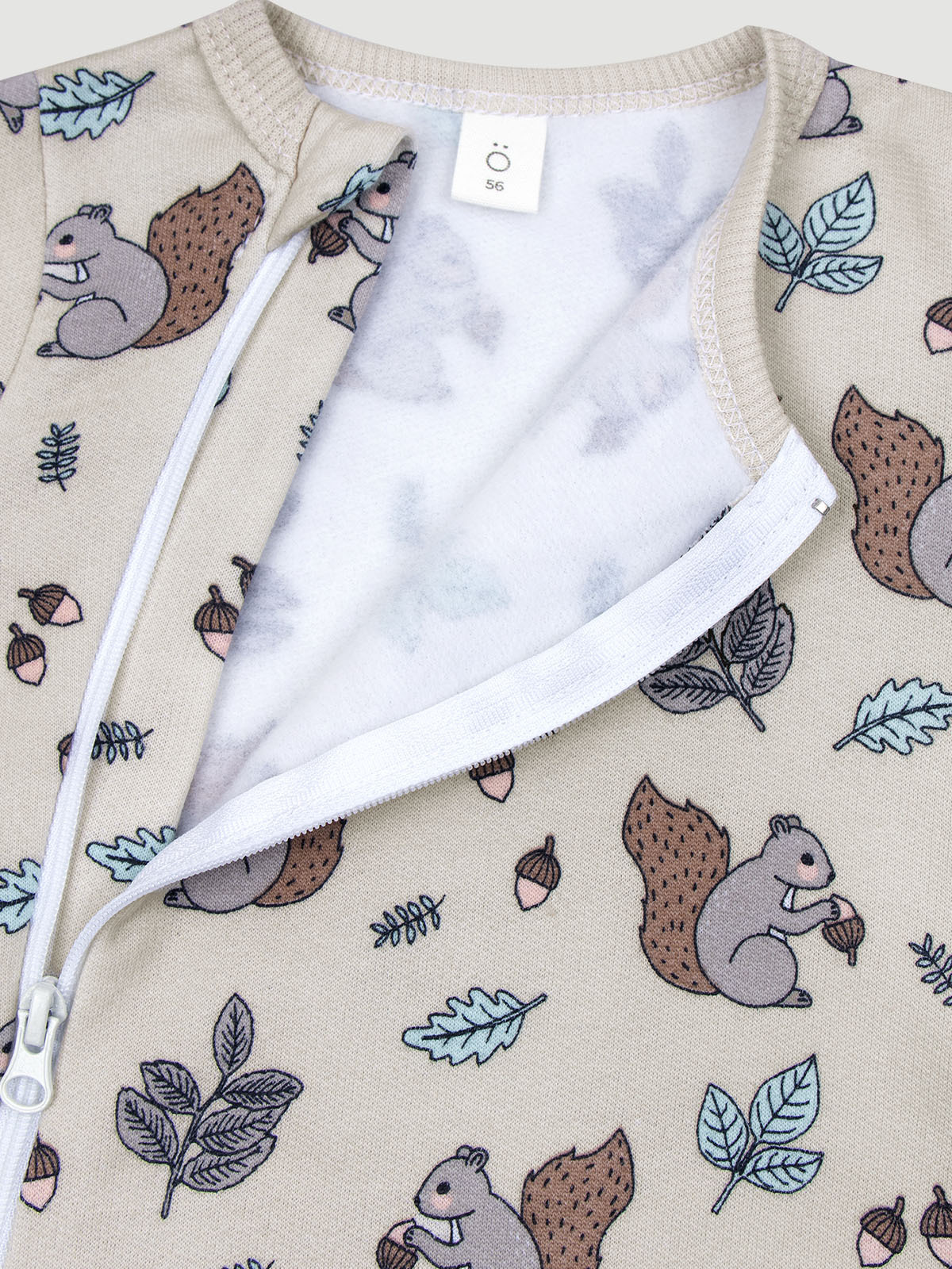 Материал плотный и приятный на ощупь, не вызывает аллергии. Молния изнутри защищена планкой, поэтому не соприкасается с нежной кожей малыша, а на вороте у шеи дополнительно нашит трикотажный язык. Он закрывает бегунок и не даёт застёжке раскрыться.