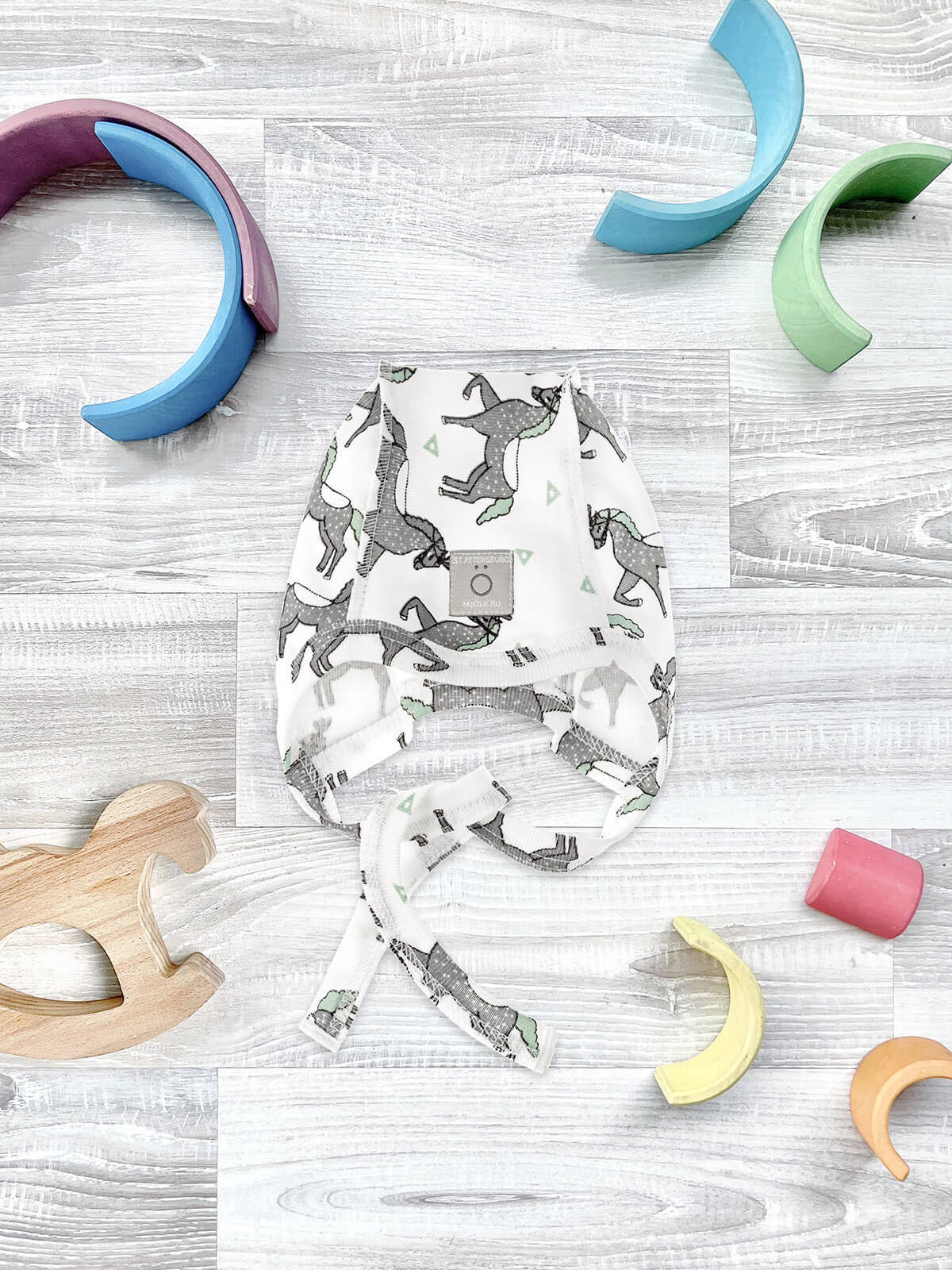 Чепчик Mjölk [мьёльк] Цирковые лошадки из нежного трикотажа идеально подойдёт для новорожденных деток и малышей. Изделие выполнено швами наружу, модель садится по голове ребёнка, хорошо повторяя её форму и надёжно закрывая ушки, а завязочки мягко удерживают чепчик.
