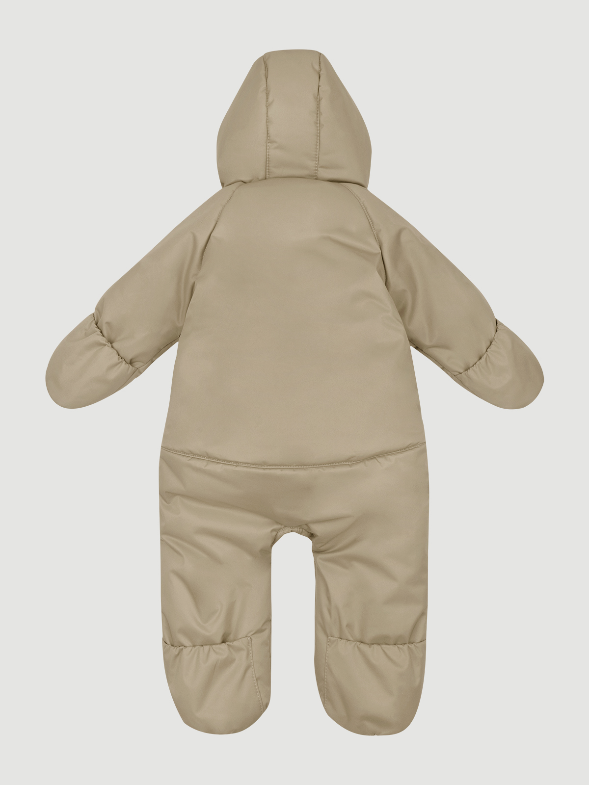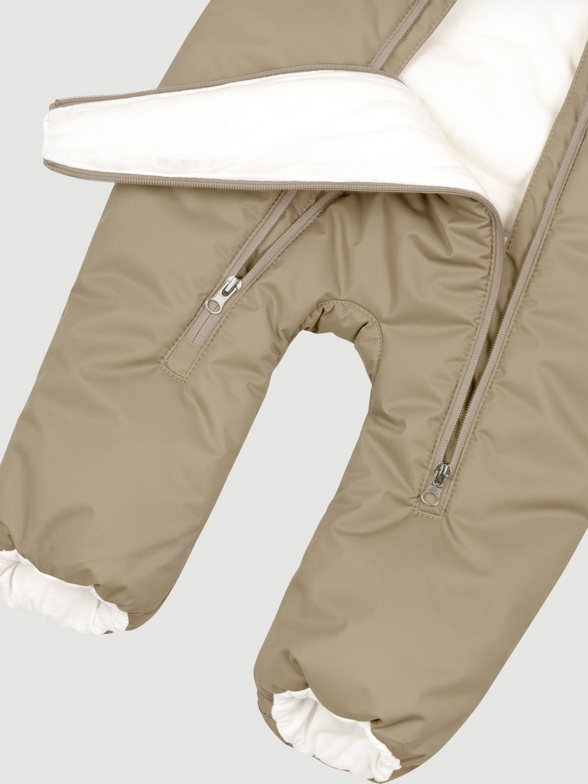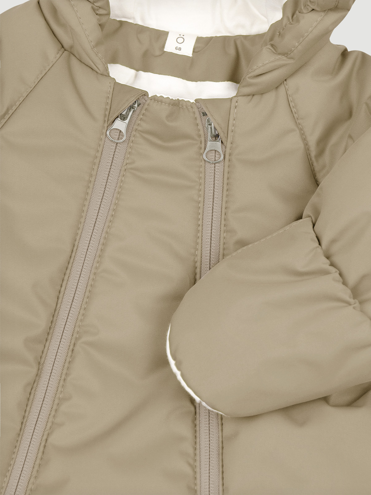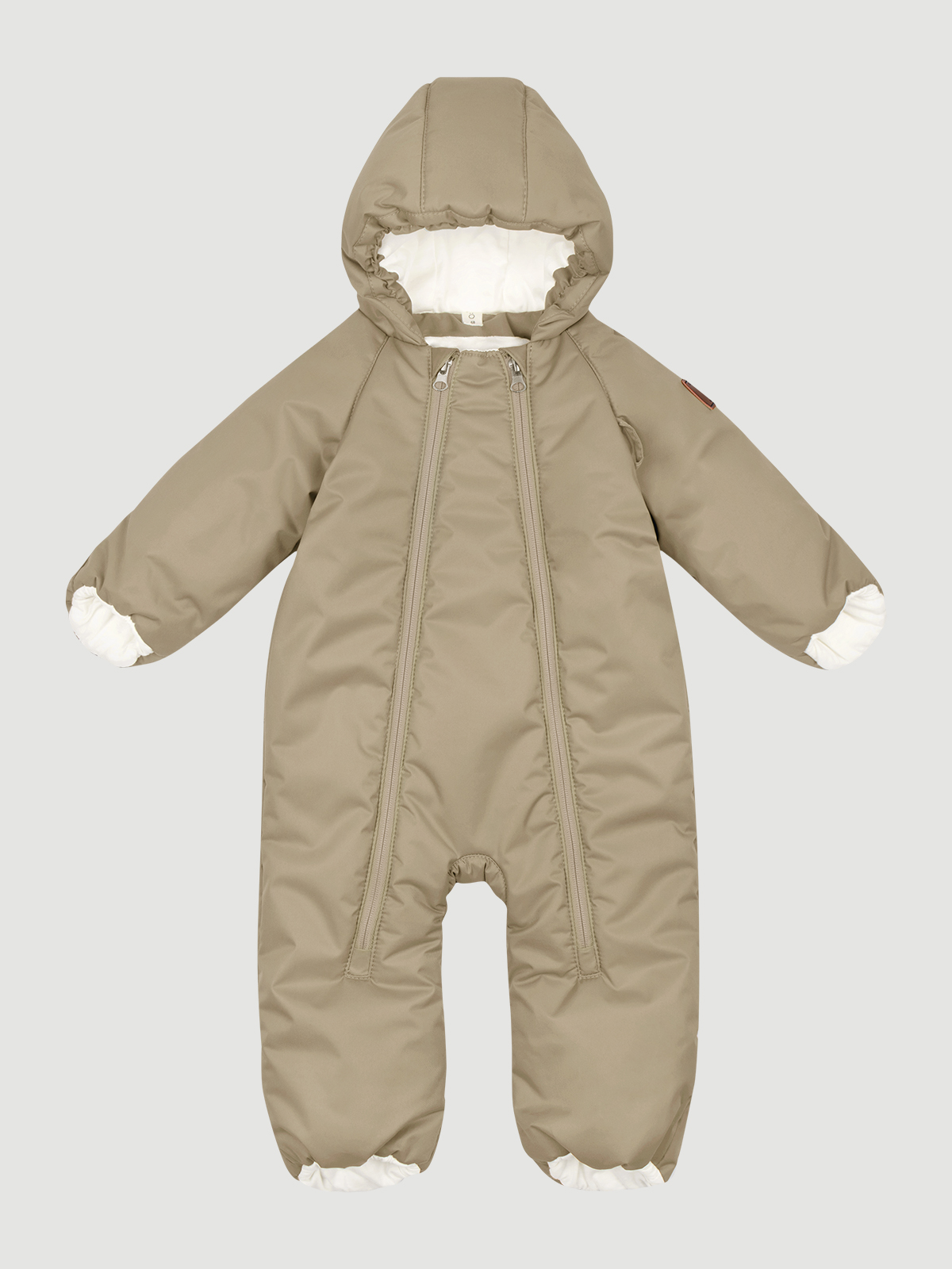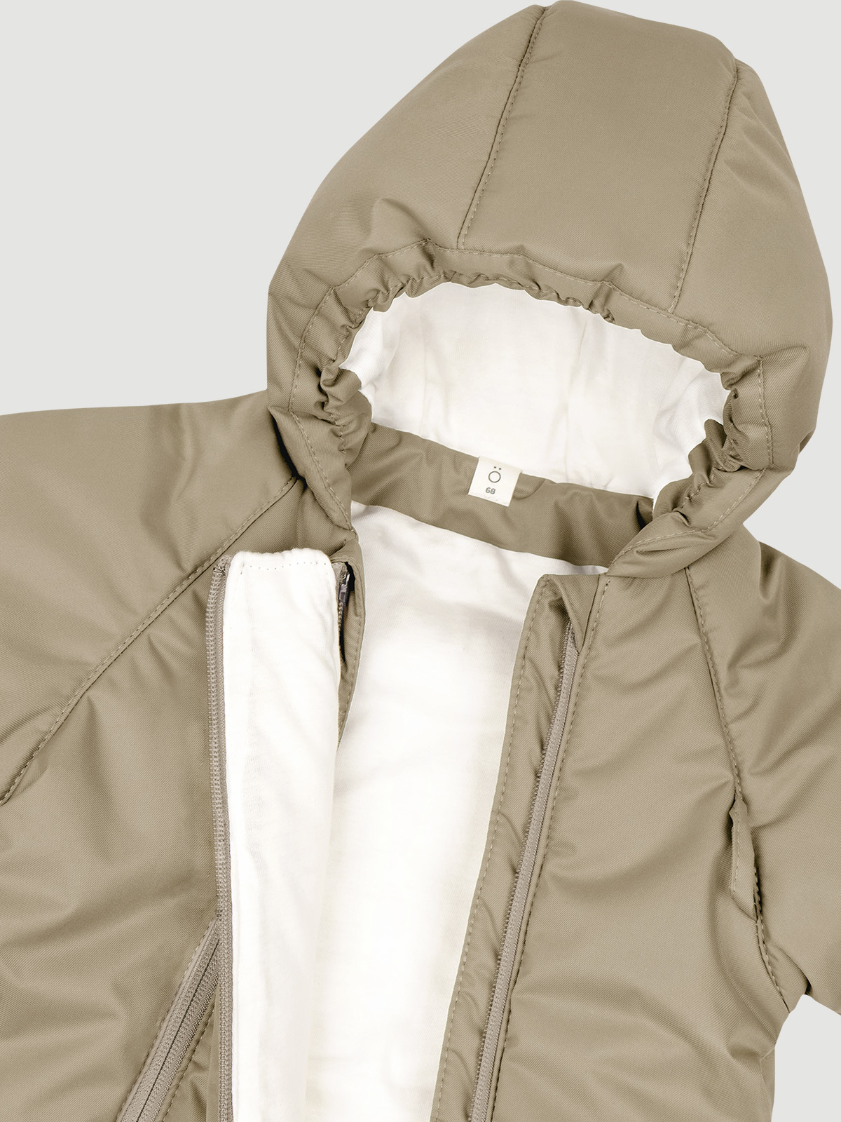 Внутри комбинезона используется лёгкий и эффективный утеплитель плотностью 100 г/м², а подкладка из нежной кулирной глади (100% хлопок) обеспечивает комфорт и бережный контакт с кожей ребёнка.