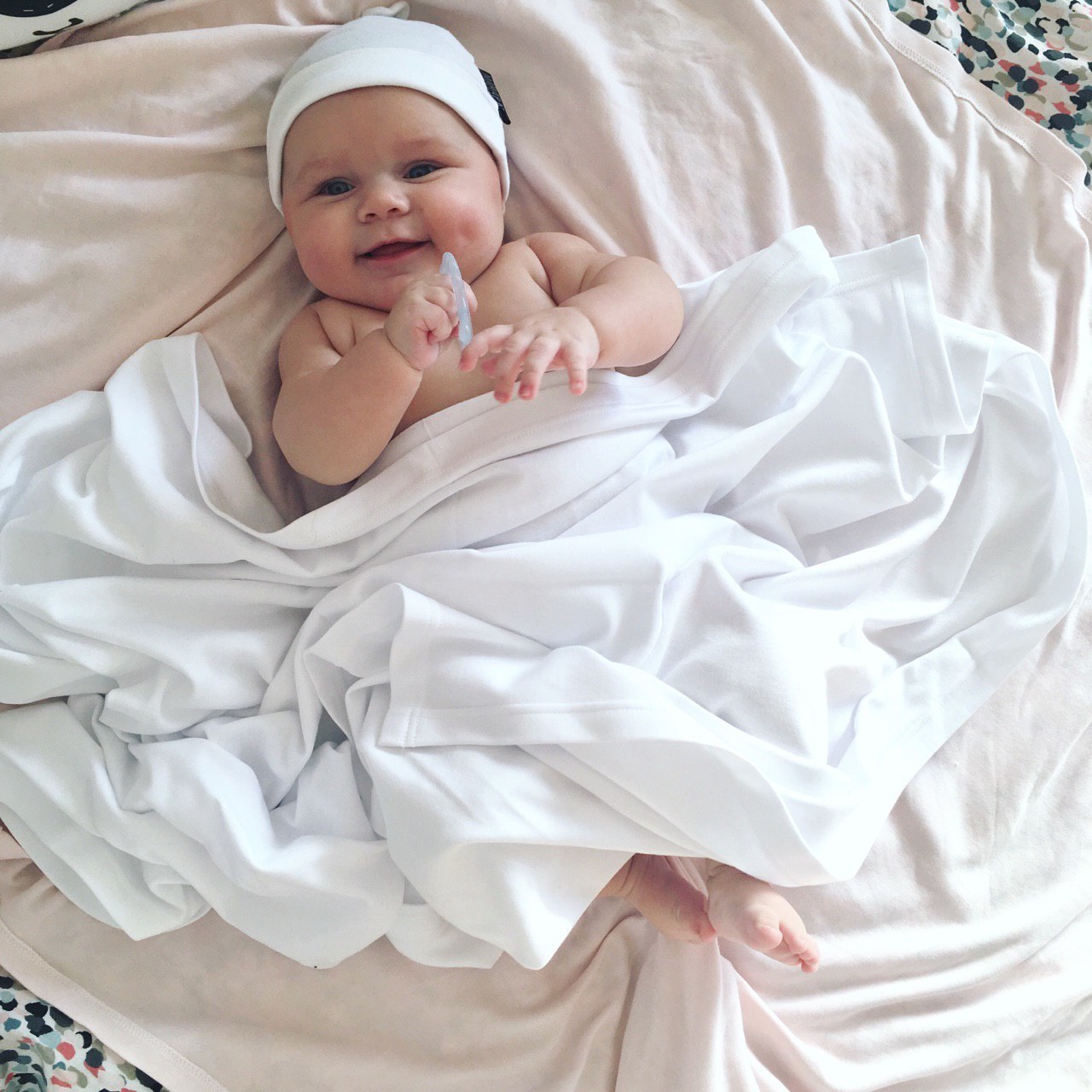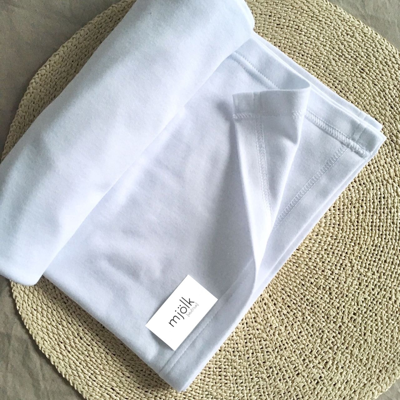 Плед-пелёнка изготовлена из трикотажного хлопка под названием интерлок. Интерлок – это плотный трикотаж двойного плетения хлопчатобумажных нитей. Одежда из такого материала долго носится, практически не мнётся, хорошо сохраняет цвет и форму. Плюсы материала: