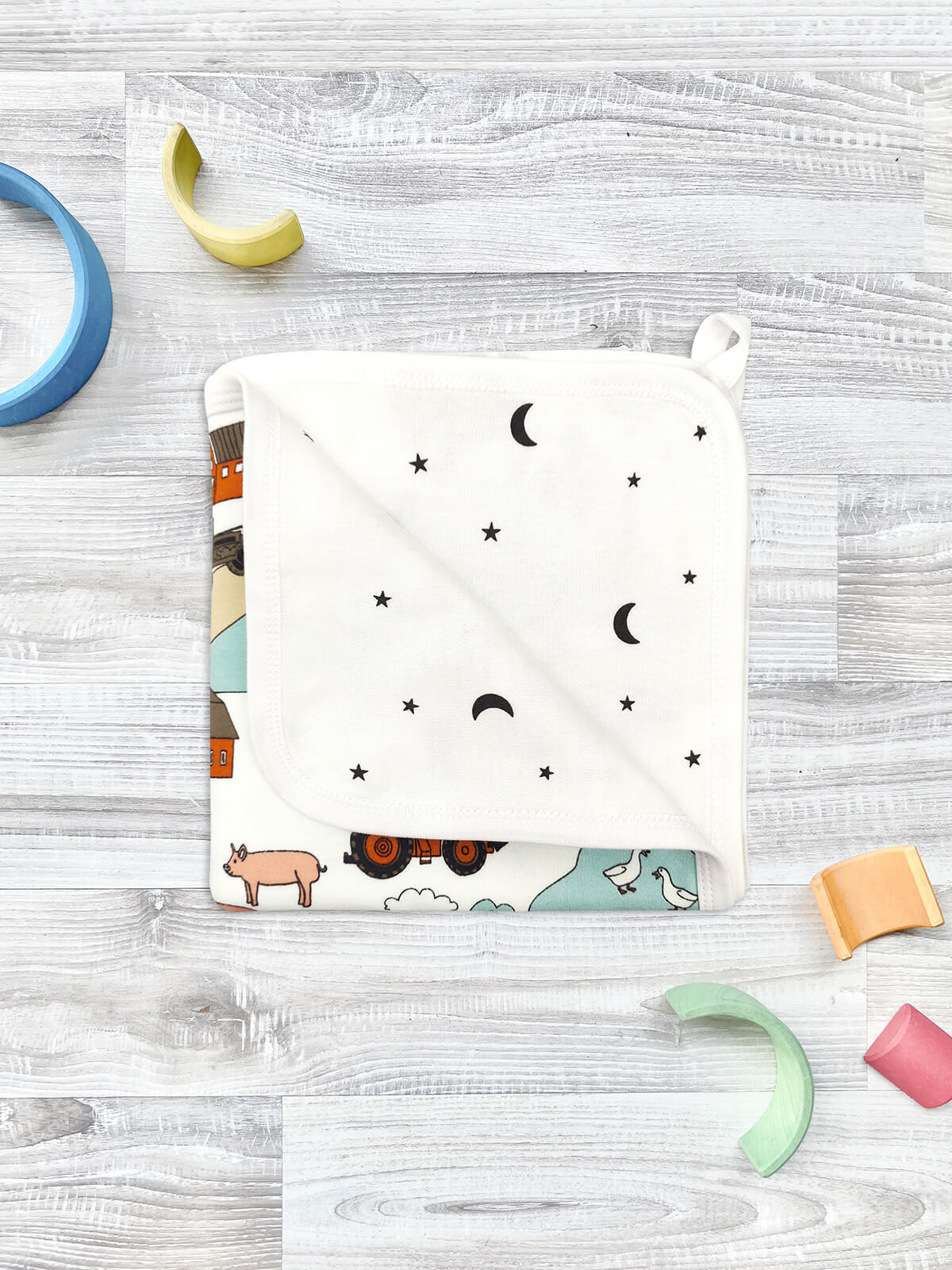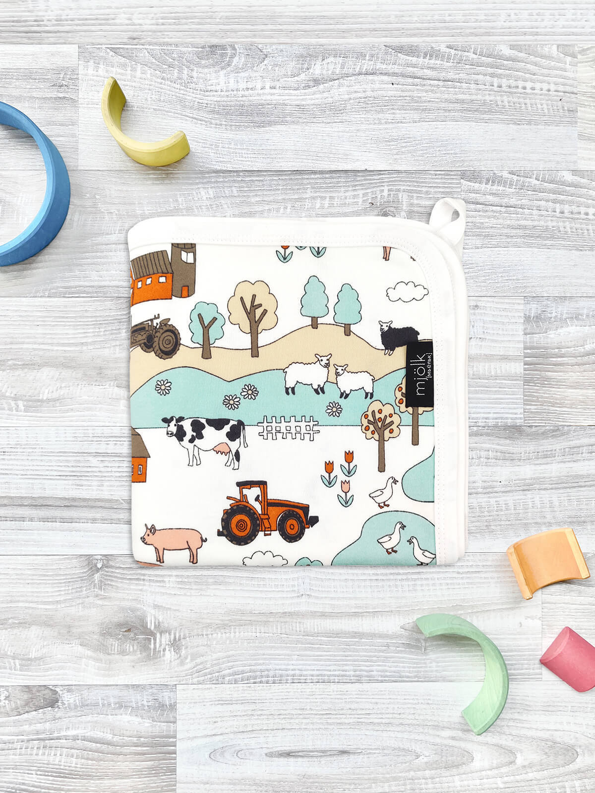 Двусторонний плед Mjölk [мьёльк] Ферма выполнен из двух слоёв трикотажного 100% хлопка без наполнителя. Плед украшает шахматная раскладка.  Размер пледа можно выбрать: 80 см*80 см или 120 см*85 см. Материал нежный и мягкий, дышит, не вызывает аллергии и дарит ребёнку уют. Плед можно использовать для сна в кроватке, коляске и автокресле, как накидку для кормления. Яркий принт делает его отличным фоном для фотосессий в домашних условиях или на улице. Изделие хорошо сочетается с шапочками, комбинезонами и пелёнками в тон.