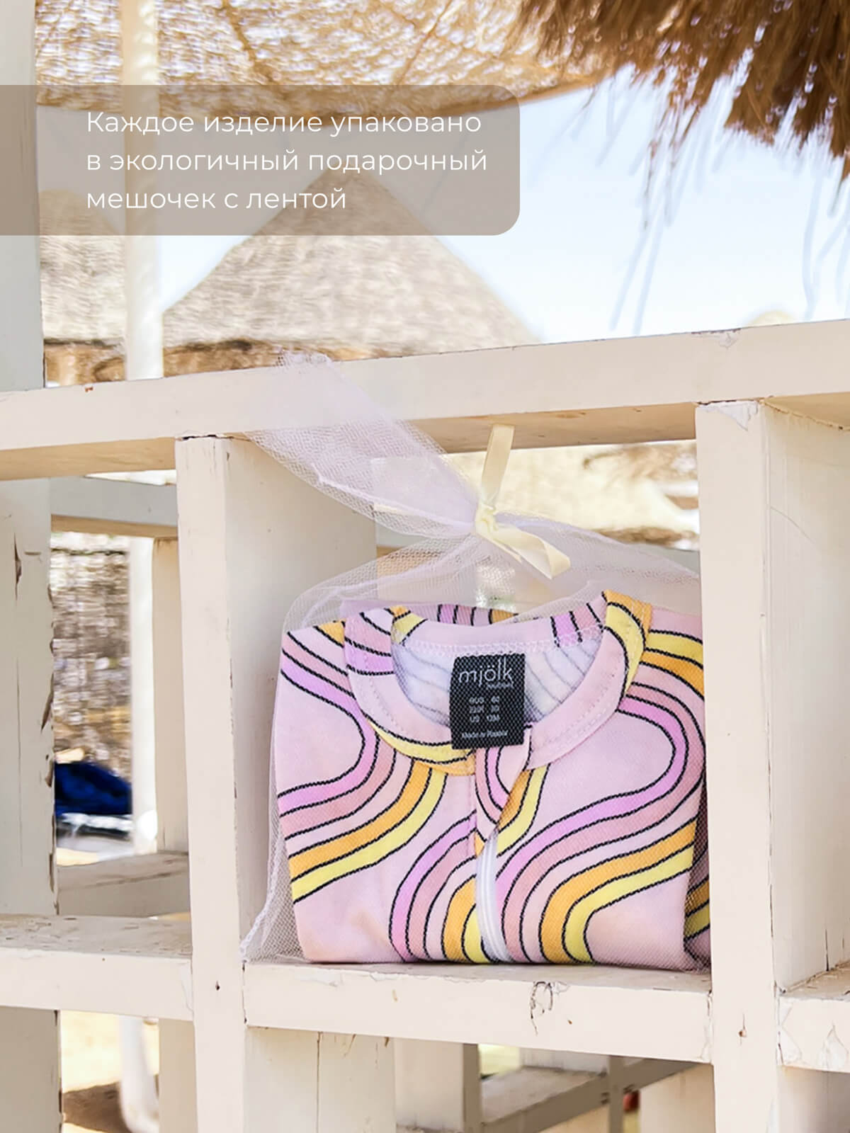 Лонгслив упакован в нежный фатиновый мешочек с лентой и станет отличным подарком любому, у кого в семье есть малыш.