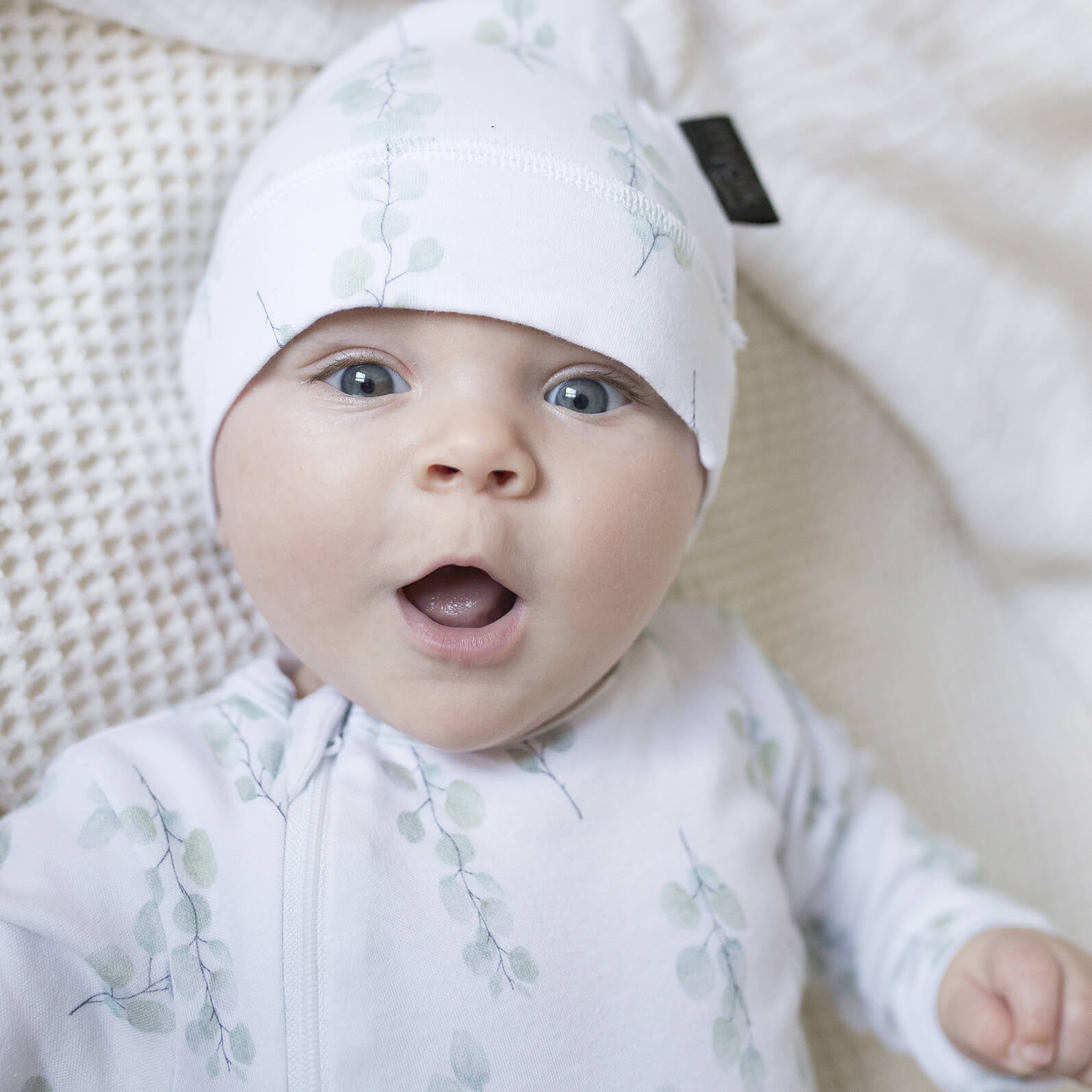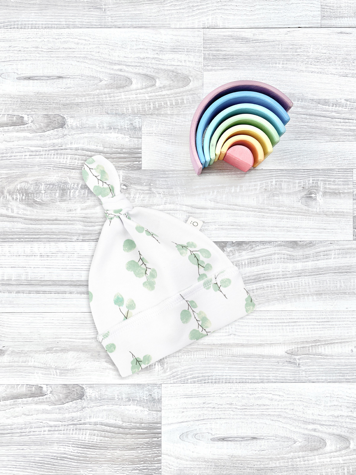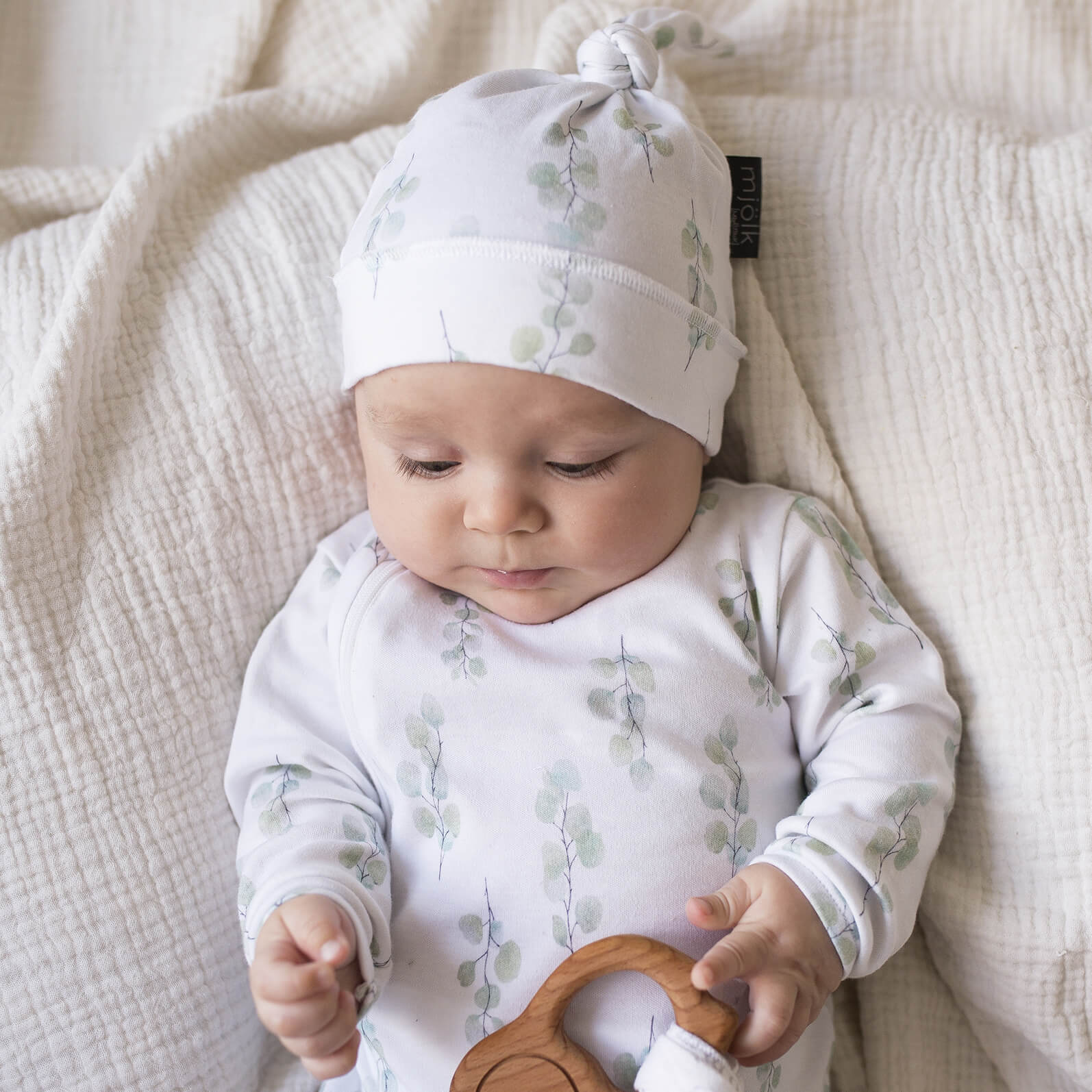 Шапочка с узелком Mjölk Эвкалипт выполнена из нежного трикотажного 100% хлопка. Материал эластичный, не вызывает аллергии, дарит ребёнку уют и комфорт, а нежный принт придаёт малышу изысканный и милый образ.
