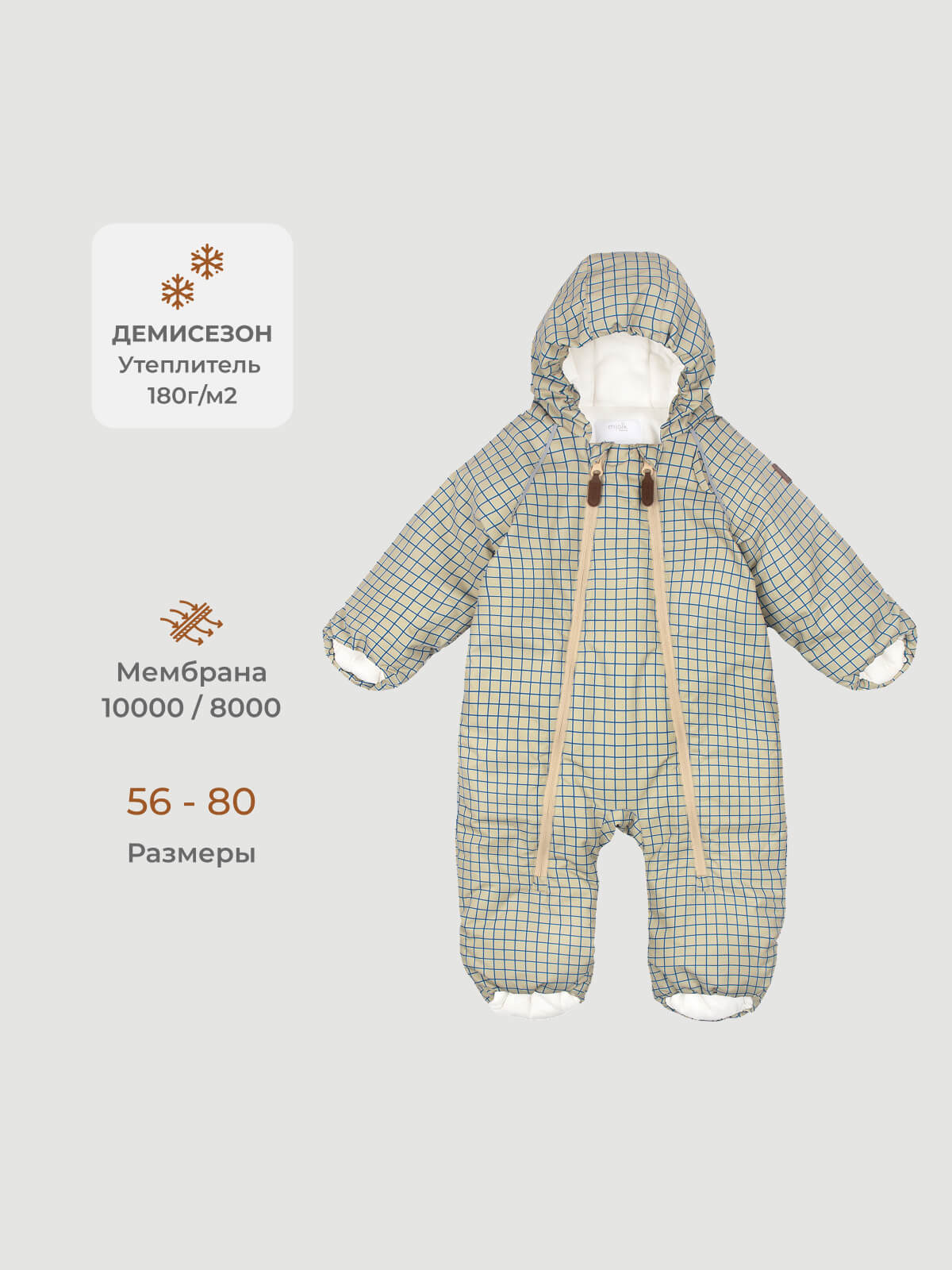 Комбинезон для новорожденного малыша – идеальный выбор для прохладного времени года. Верхняя ткань изделия – мембрана с показателями 10000/8000 (Водостойкость/ Воздухопроницаемость). Одежда из мембраны защитит ребенка от дождя и ветра, а также обеспечит комфорт при активных играх на свежем воздухе. Особенность мембранного комбинезона в том, что мембрана обладает отличными дышащими свойствами и хорошо отводит излишки влаги от тела, предотвращая перегрев. Также комбинезон демисезонный за счет свойств ткани не пропускает влагу снаружи и ветер. Комбинезон для мальчиков и для девочек выполнен из современного и легкого утеплителя плотностью 180 г/м2. Демисезонный комбинезон для новорожденных можно носить от -10 до +5 градусов. Температурный режим носит рекомендательный характер, так как у всех детей разный теплообмен, а комфорт ношения зависит от вида одежды под комбинезоном. Комбинезон теплый для мальчика и для девочки имеет две молнии с защитными кармашками. Прогулочный зимний комбинезон очень мягкий внутри, по всему комбинезону использован трикотажный подклад из 100% хлопка. По линии лица проходит эластичная резинка, которая защитит лицо крохи от проникновения холодного ветра и снега.